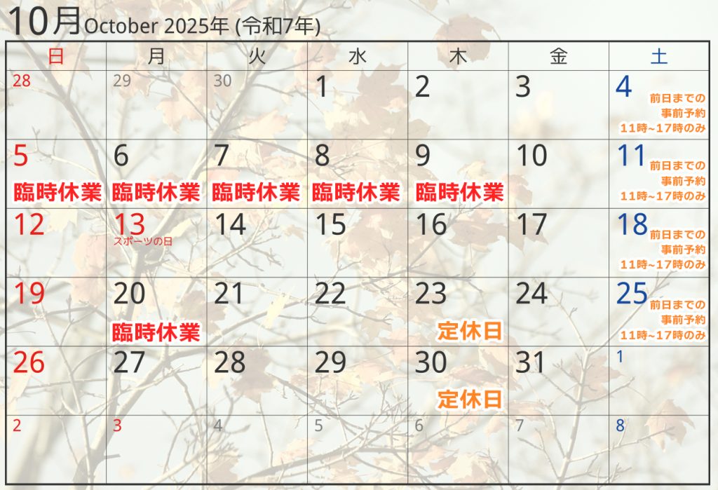 今月は臨時休業が多く、営業日もイレギュラーになっております。